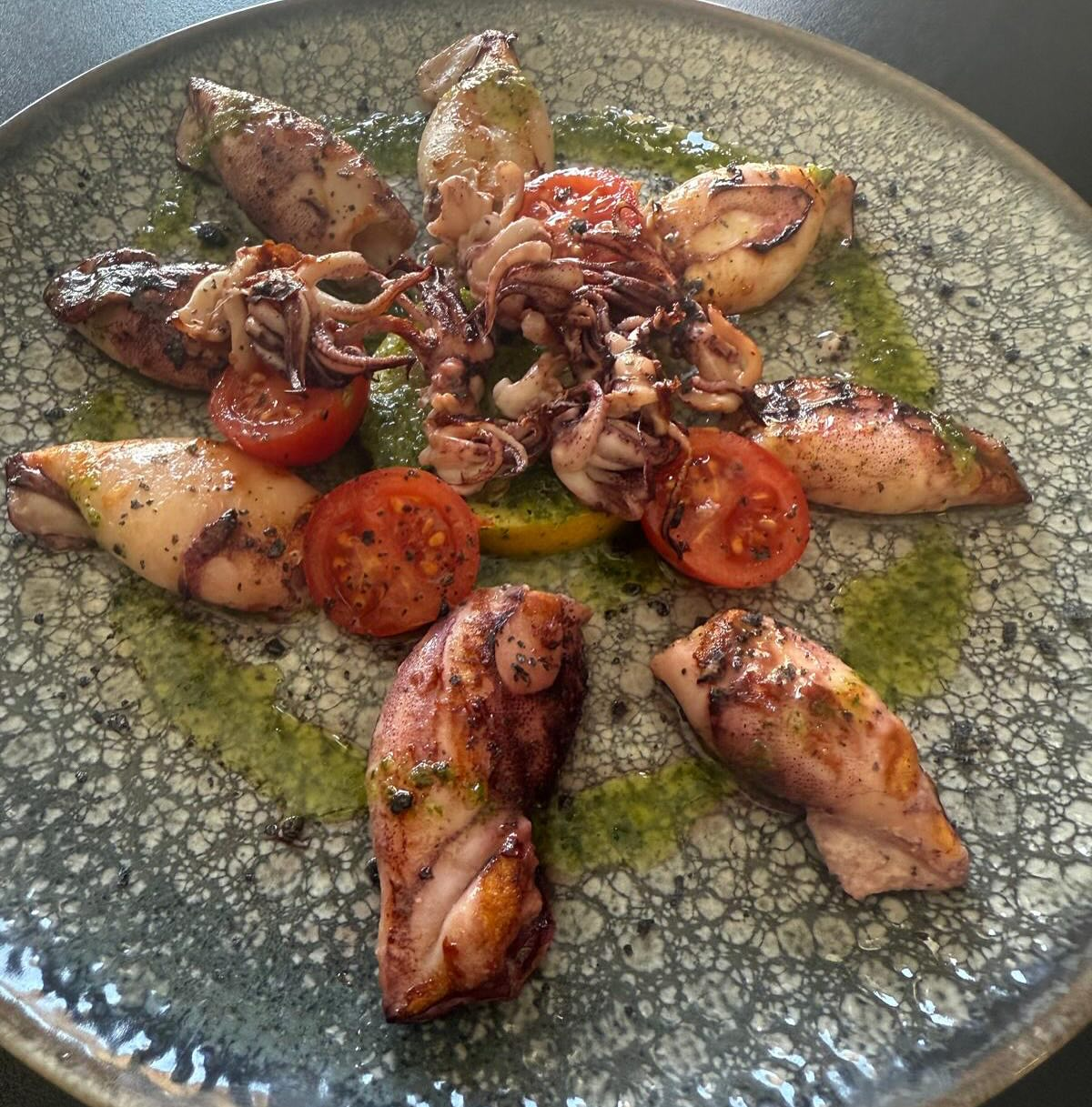 Tentáculo de pulpo cocido a baja temperatura y acabado en brasa, sobre crema de patata con trufa. Un plato que combina textura, aroma y sabor.